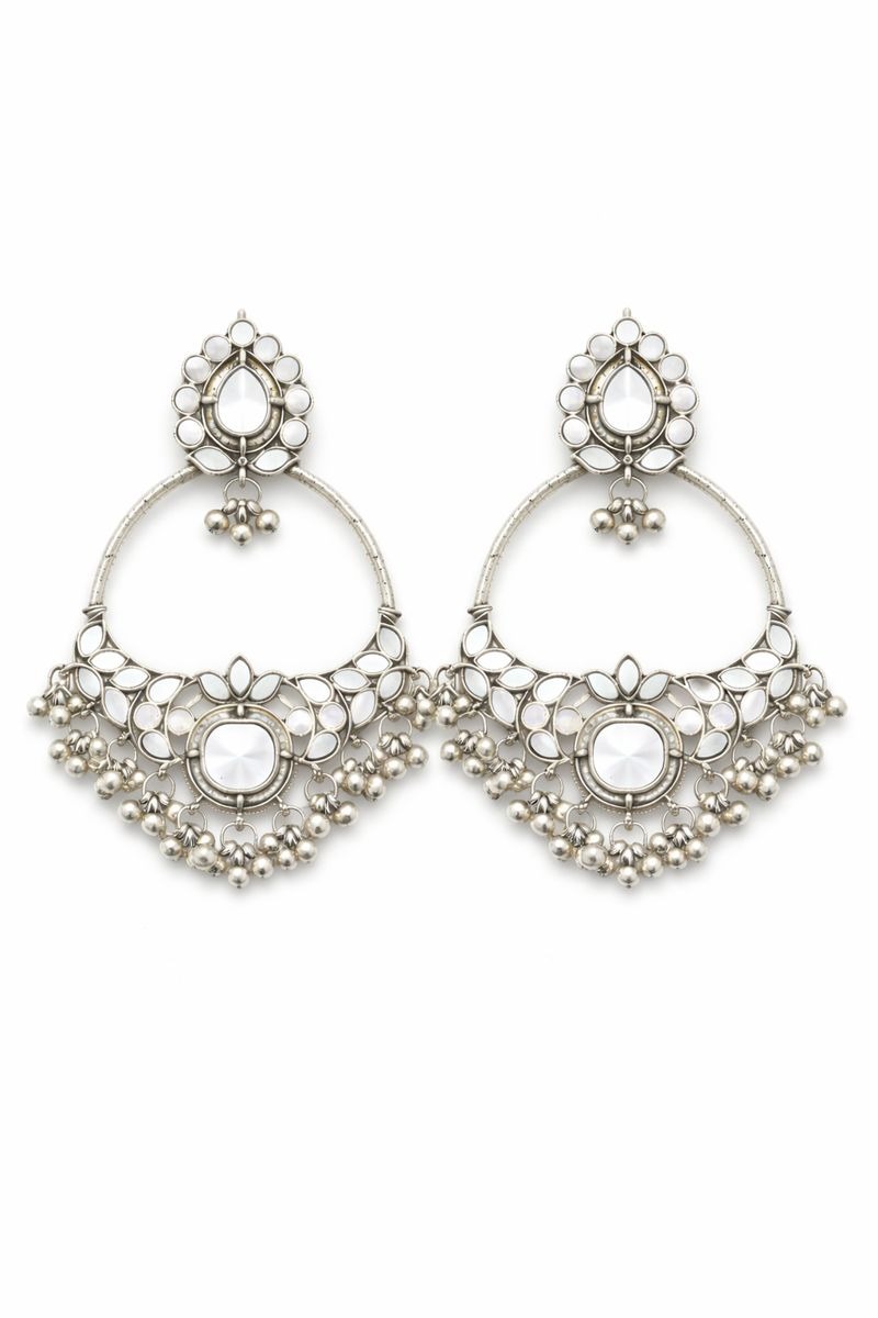 These stunning oxidized silver jhumka earrings feature a beautiful floral stud design with a teardrop stone in the center, connected to a large circular hoop. The bottom is adorned with delicate ghungroo beads that create a graceful movement and soft jingling sound.