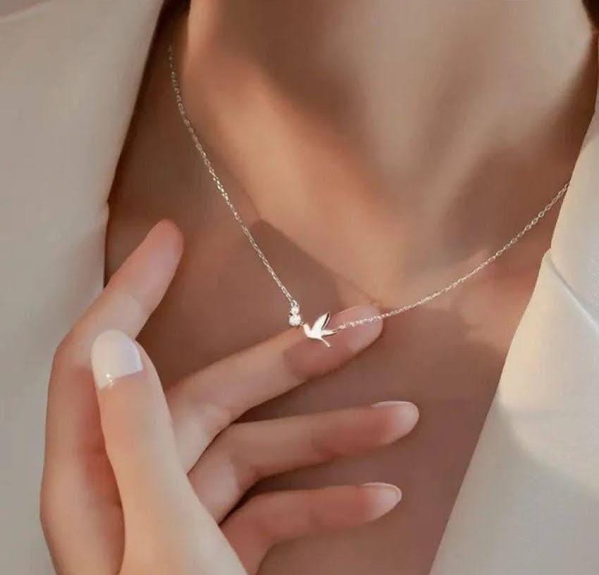 A delicate silver-toned necklace featuring a graceful bird charm and a tiny sparkling stone. Simple, elegant, and perfect for everyday wear or gifting.