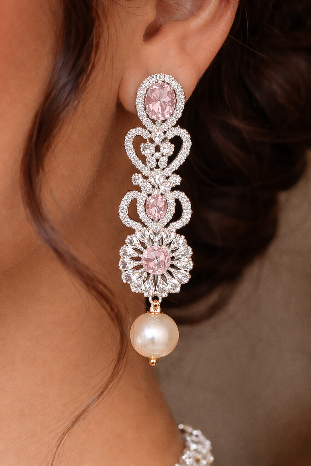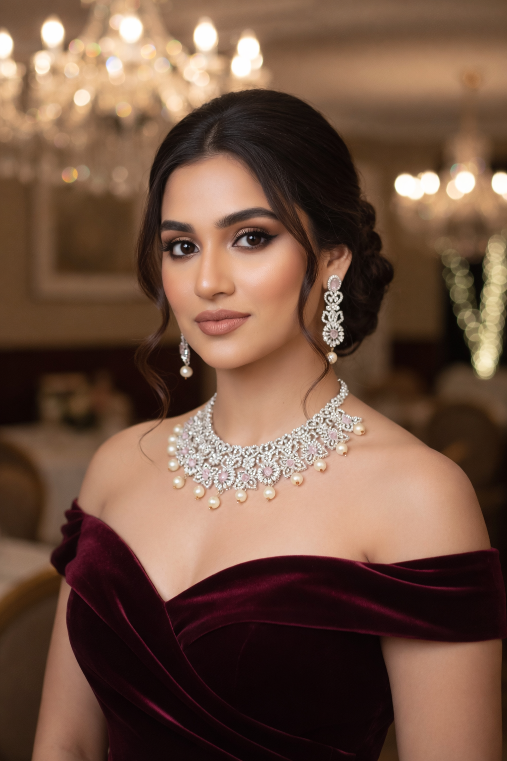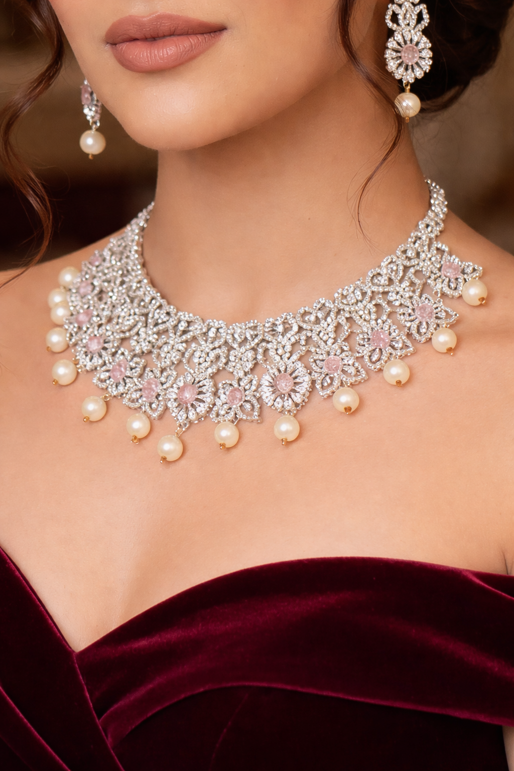 An exquisite statement jewelry set crafted with intricate silver-toned detailing, sparkling white stones, and soft blush-pink centerpiece gems. The necklace features delicate floral and heart-inspired patterns adorned with luminous pearl drops, creating a regal and graceful look.