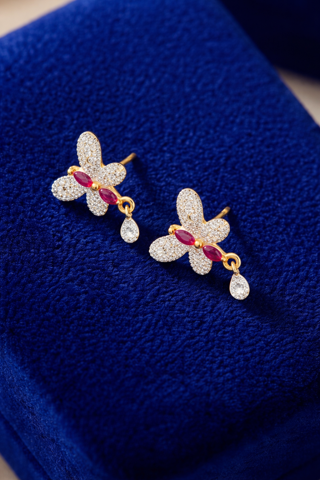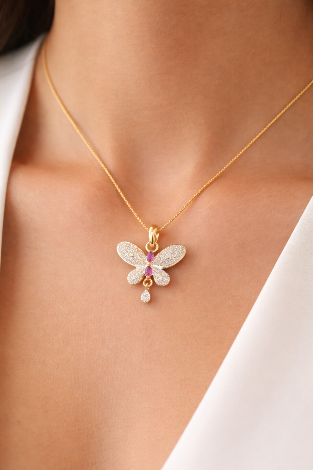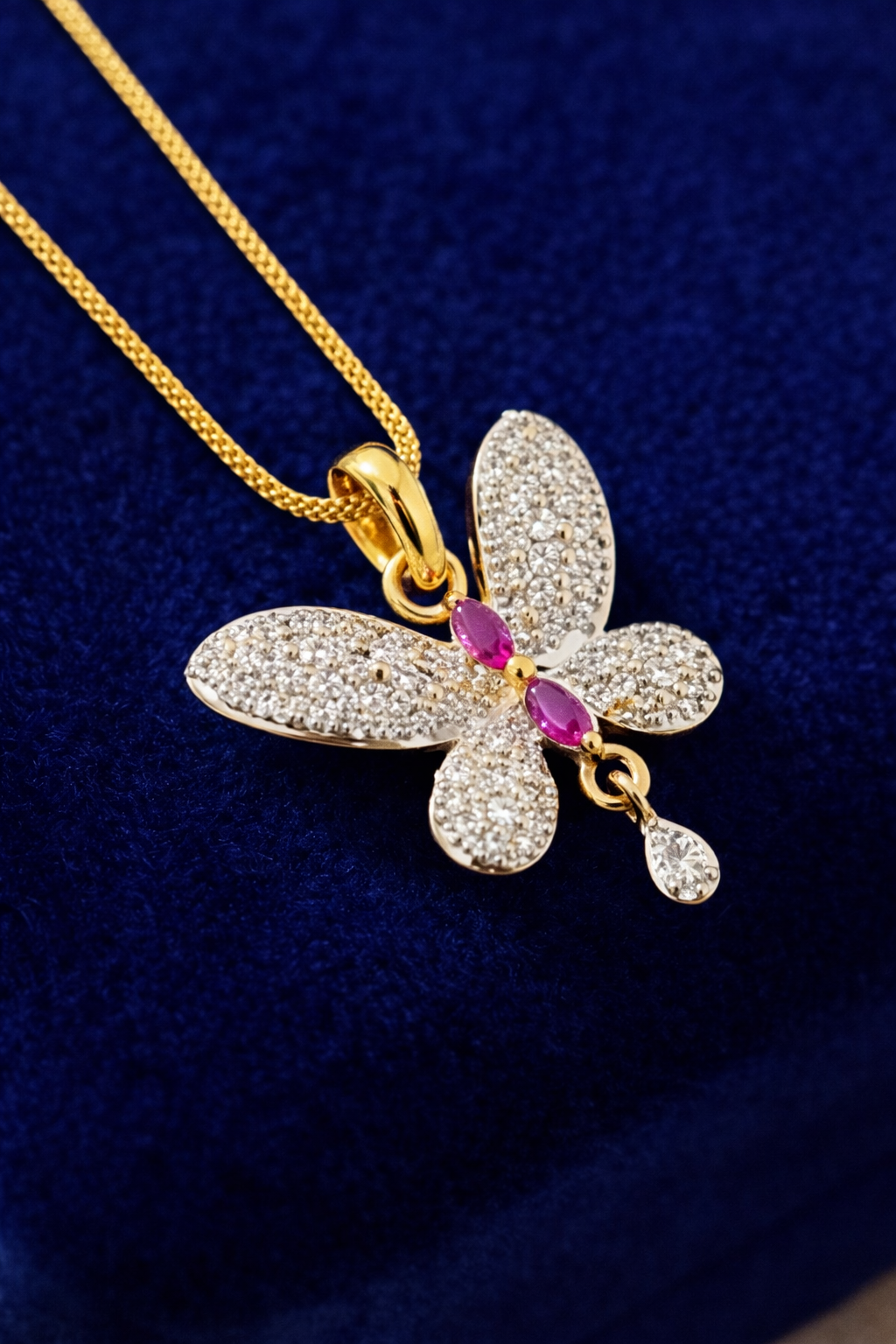 Delicate and enchanting, the Butterfly Grace Diamond Pendant is a symbol of elegance and transformation. Crafted in a radiant gold finish, this butterfly-shaped pendant is beautifully adorned with shimmering diamond-like stones that sparkle with every movement. The center features two vibrant pink stones, adding a graceful pop of color, while a single dangling teardrop crystal enhances its charm. Perfect for daily elegance or special occasions, this pendant brings a soft, feminine glow to any look and makes a timeless gift for someone special.