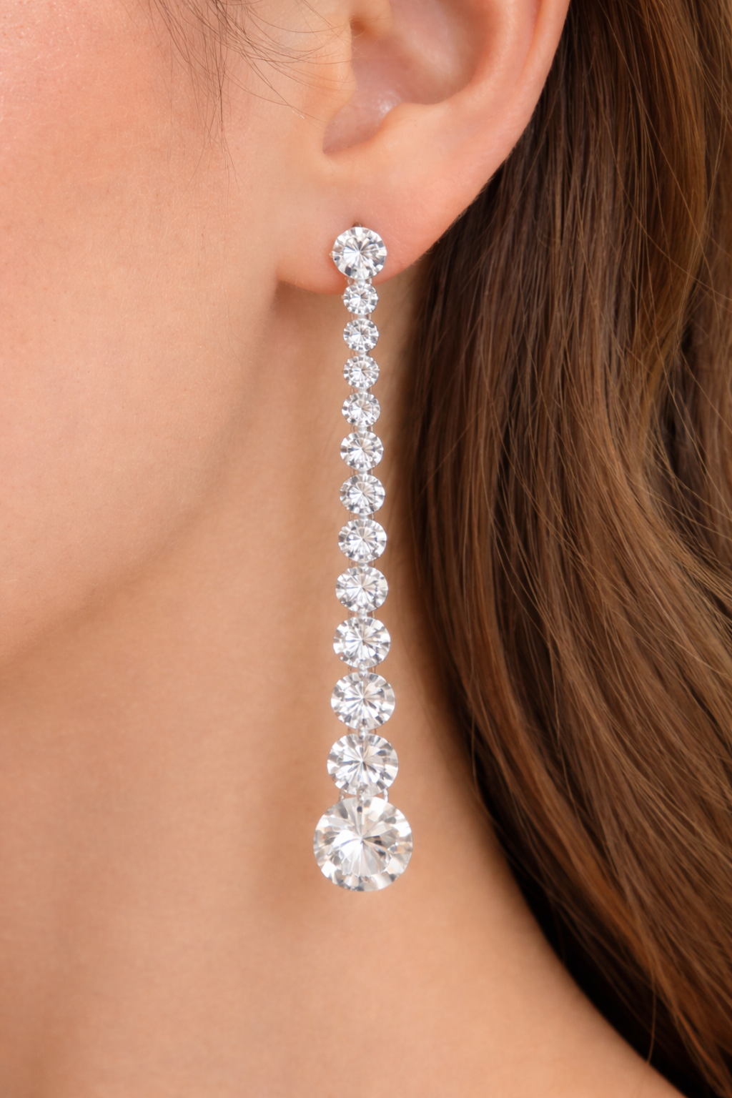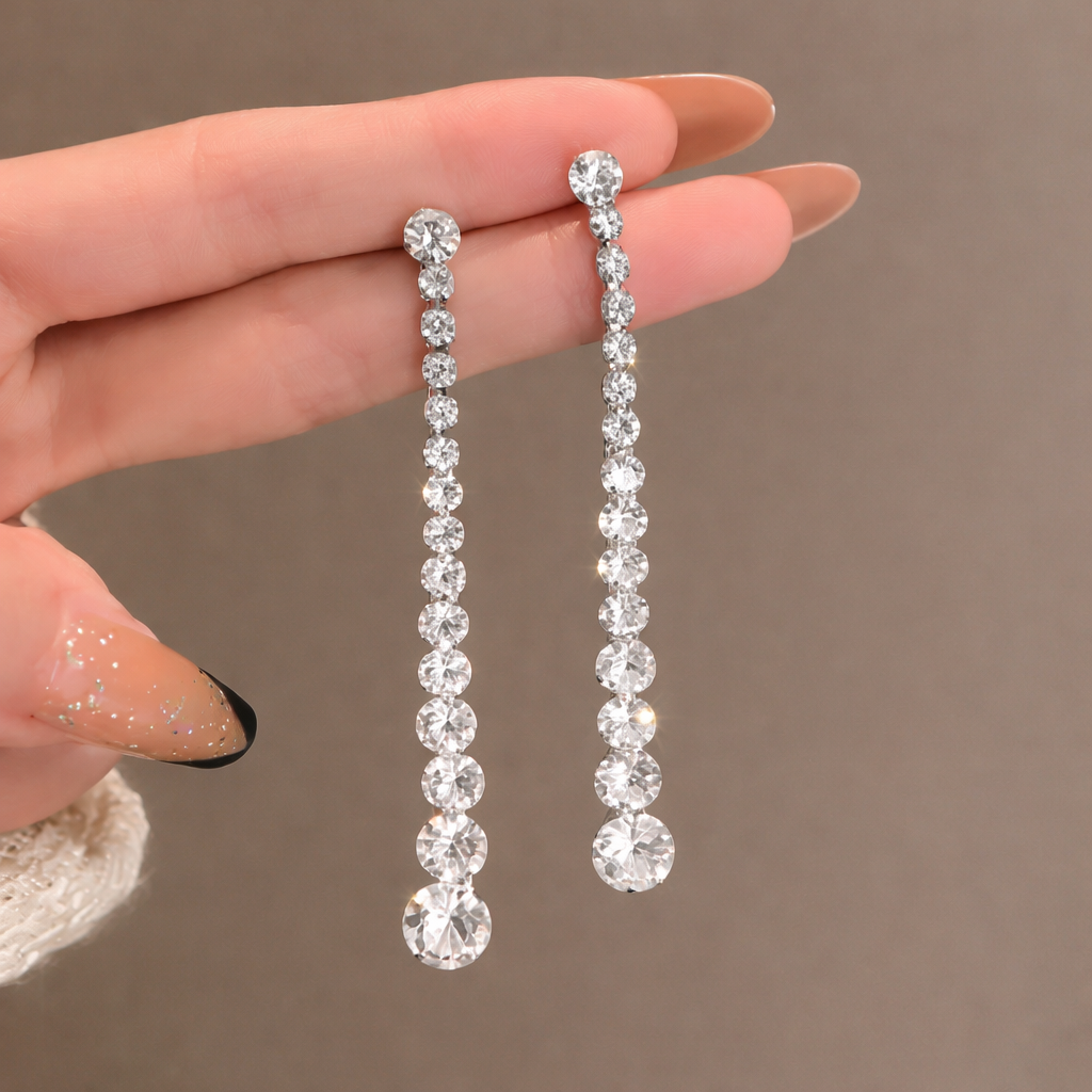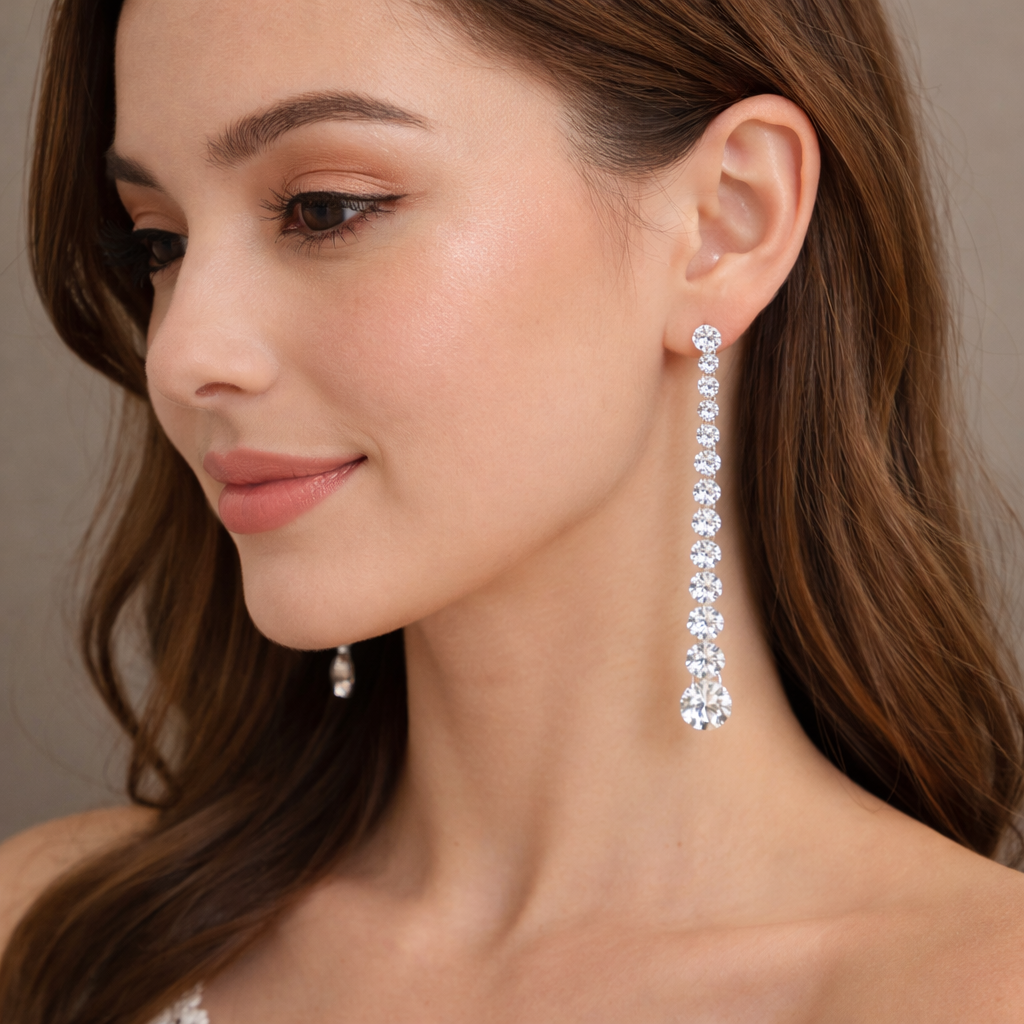 These elegant Crystal Cascade Drop Earrings feature a sleek vertical design adorned with brilliantly cut clear crystals that gradually increase in size towards the bottom. The refined silver-tone setting enhances the sparkle of each stone, creating a graceful and luxurious cascading effect.