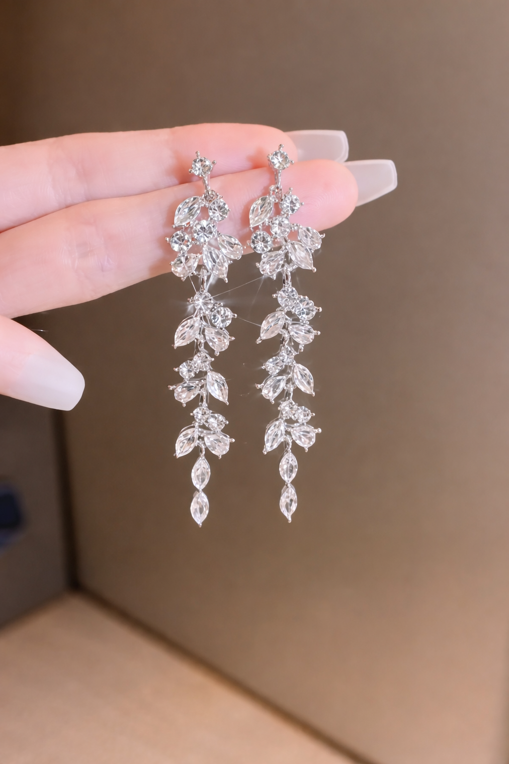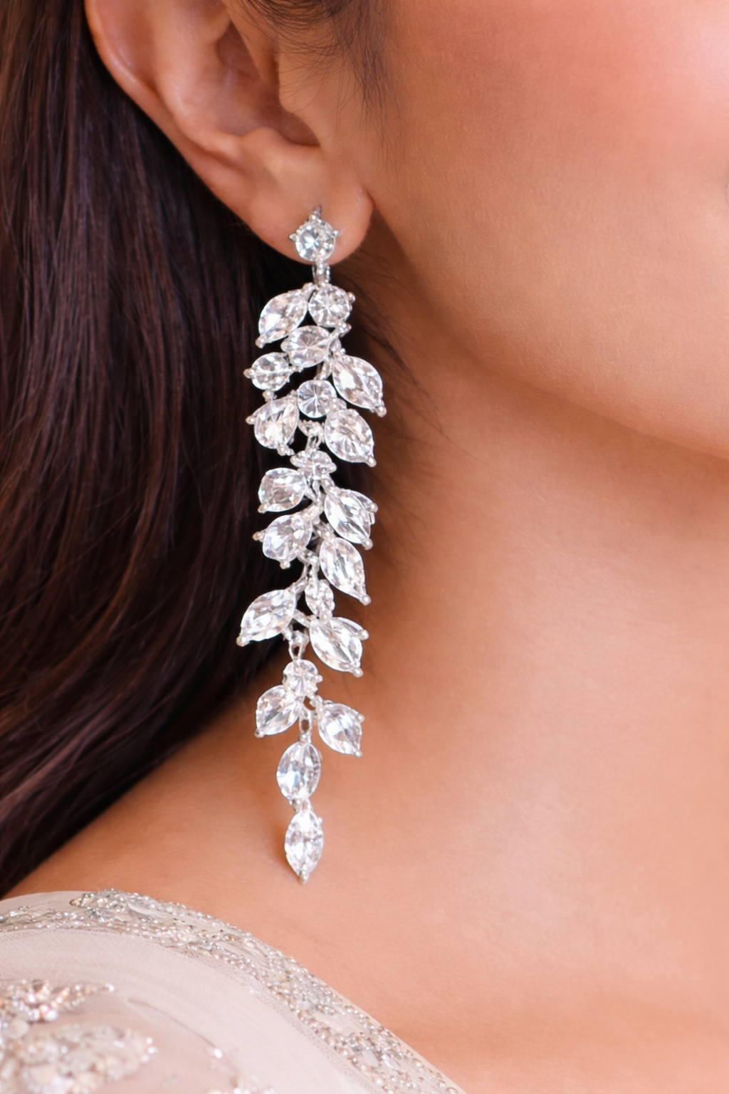 Elegant leaf-inspired drop earrings crafted with high-shine crystal stones. The cascading vine design gives a graceful, elongated look, while the brilliant sparkle adds a luxurious touch. Lightweight yet statement-making, these earrings are perfect for weddings, parties, receptions, and festive occasions. Pair them with ethnic or evening wear for a classy, glamorous finish