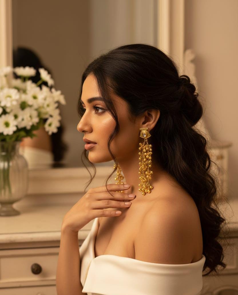 Stunning long, gold-tone drop earrings featuring an evil-eye-inspired stud and a luxurious cascade of clustered miniature golden balls. Perfect for festive occasions and adding instant glamour.