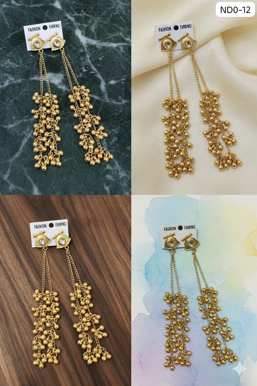 Add to wishlist Add to compareStunning long, gold-tone drop earrings featuring an evil-eye-inspired stud and a luxurious cascade of clustered miniature golden balls. Perfect for festive occasions and adding instant glamour.