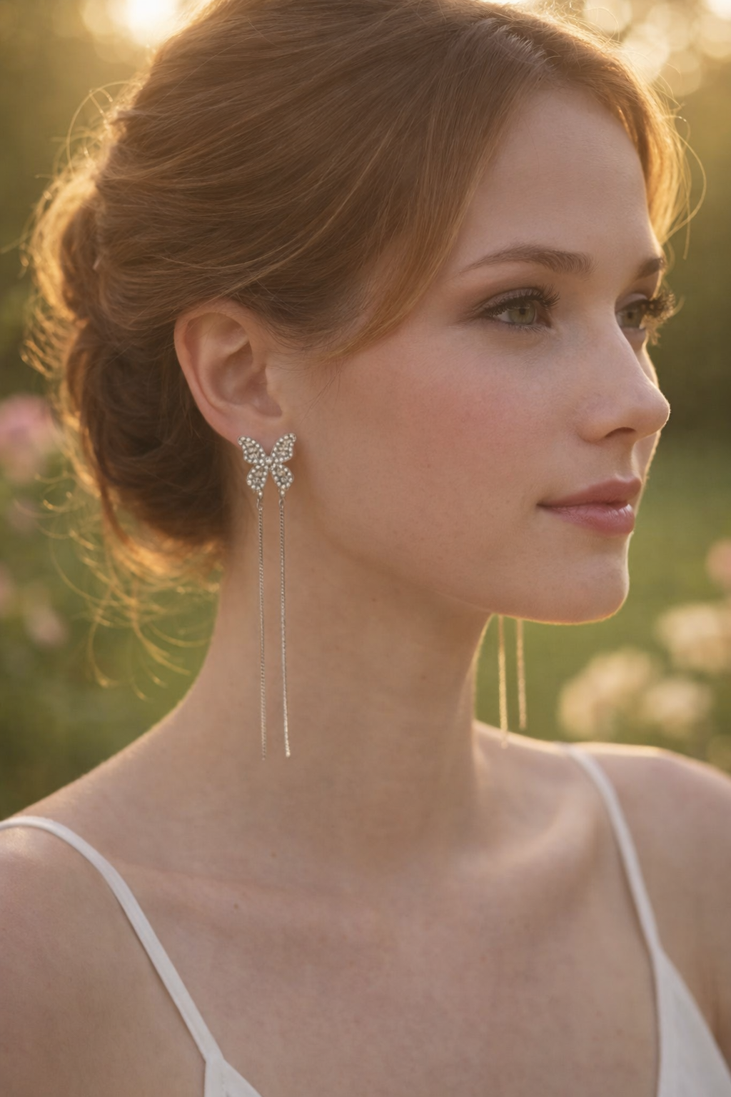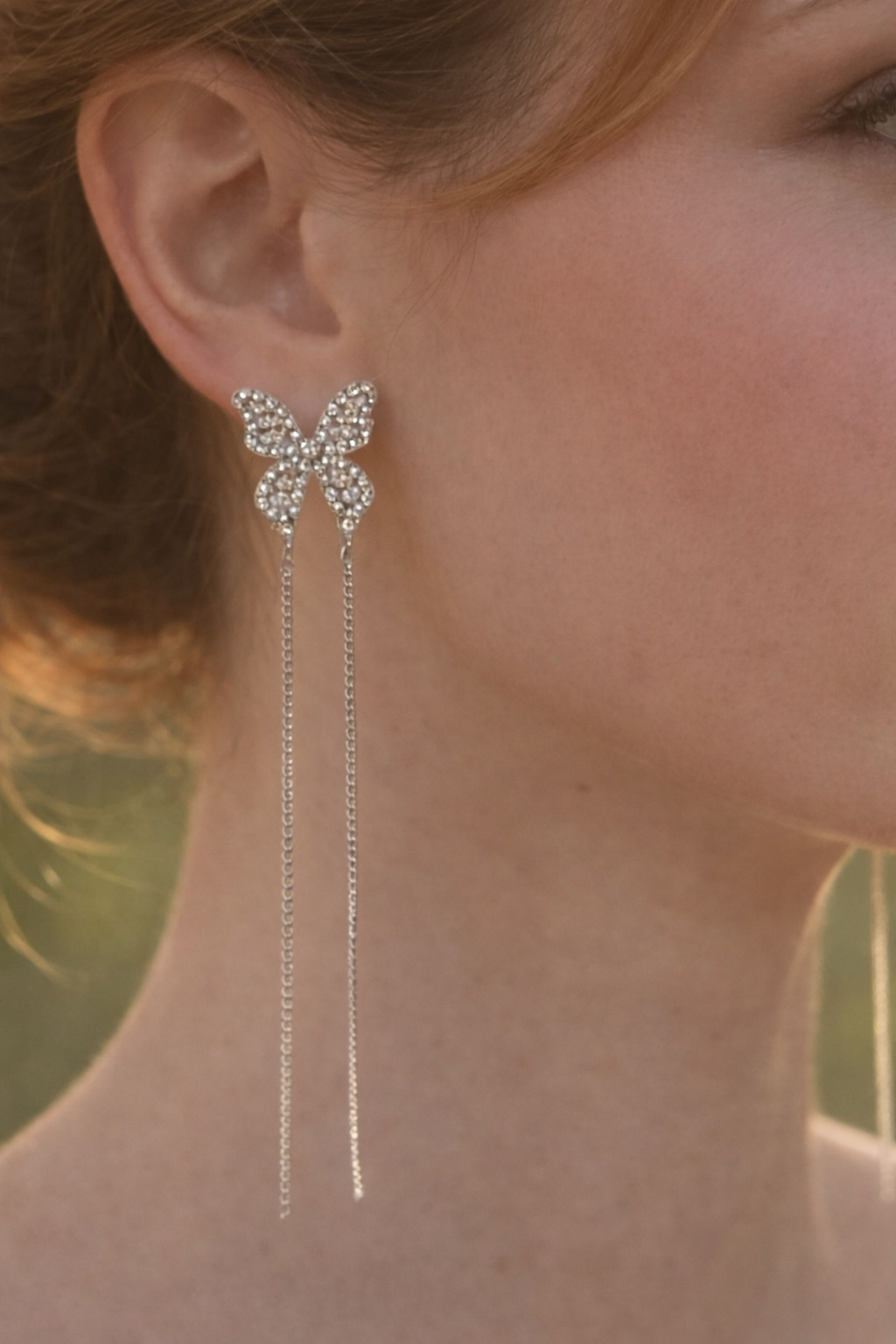 This is a crystal-clear close-up view of a delicate butterfly design, showcasing fine detailing and a smooth, polished finish. The butterfly wings have a soft, luminous shine, while the center is highlighted with sparkling stones that add elegance and charm. Every curve and edge is sharply visible, giving a premium, high-definition look. The overall appearance feels graceful, feminine, and refined—perfect for highlighting craftsmanship and beauty in a zoomed product shot.
