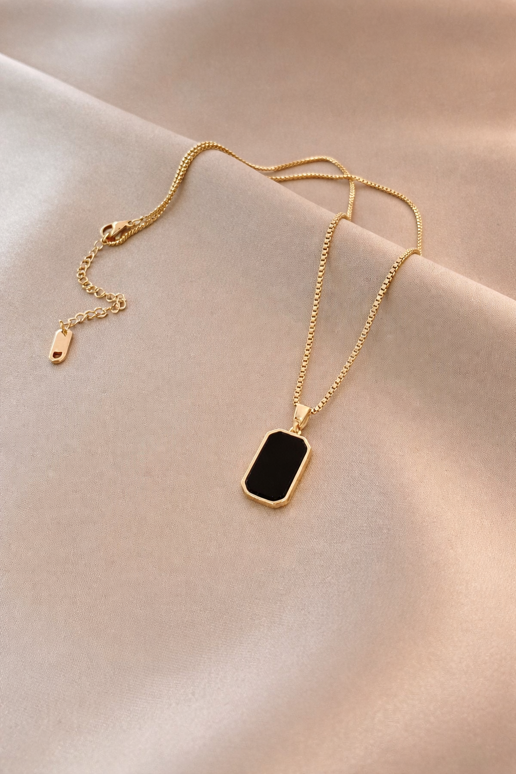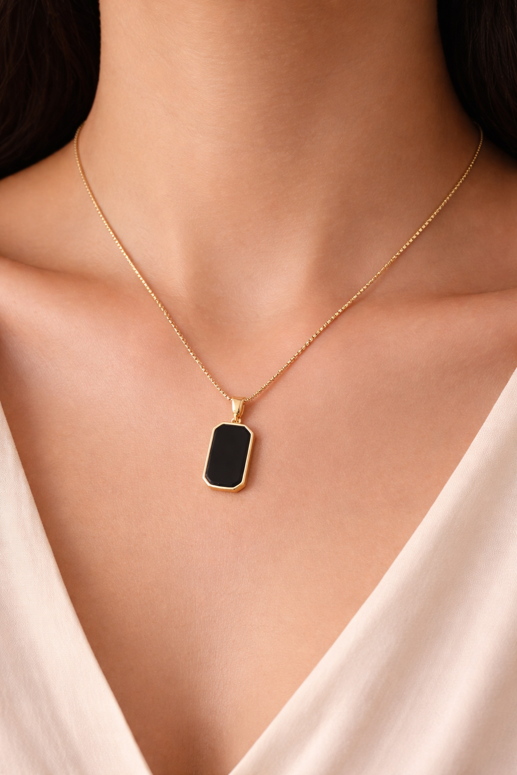 A timeless and minimal pendant necklace featuring a sleek black stone set in a refined gold-tone frame. Suspended on a delicate chain, this piece blends modern elegance with classic charm. Perfect for everyday wear or special occasions, it adds a subtle statement to both ethnic and western outfits. Lightweight, graceful, and effortlessly stylish—ideal for those who love understated luxury.