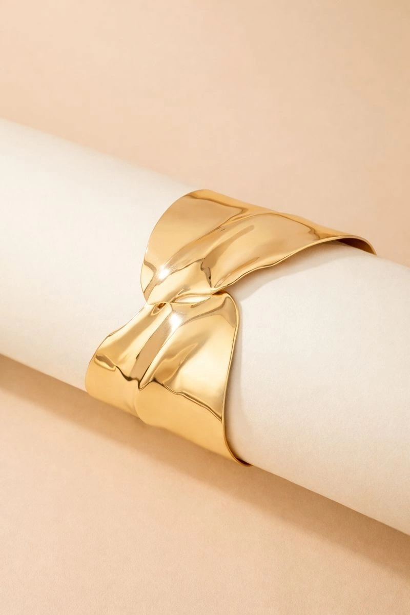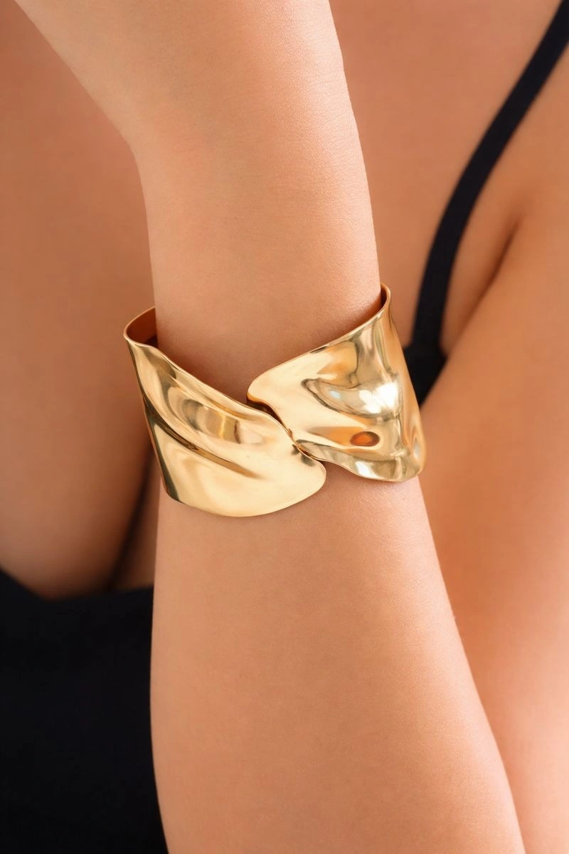 A luxurious statement cuff bracelet designed with a fluid, molten-inspired silhouette in a high-shine gold finish. The softly sculpted curves create an organic, wave-like form that reflects light beautifully and hugs the wrist with elegance. Bold yet refined, this adjustable cuff is perfect for evening wear, special occasions, or adding an artistic edge to modern outfits.