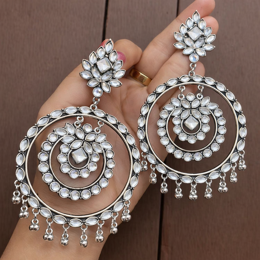 Elevate your look with the timeless elegance of Royal Chandrika Silver Kundan Earrings. Designed with a graceful floral stud and layered circular hoops, these earrings are adorned with shimmering kundan-style stones that catch the light beautifully. The delicate dangling beads add a subtle movement, enhancing their traditional charm. Crafted in an antique silver finish, these statement earrings are perfect for weddings, festive occasions, and ethnic celebrations, adding a touch of royalty and sophistication to any outfit.