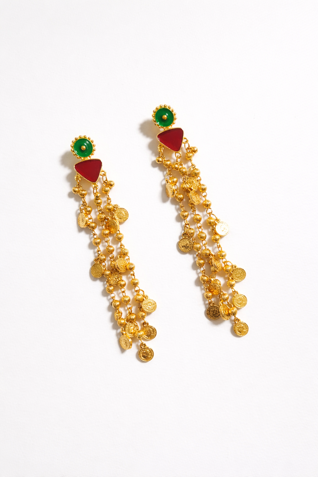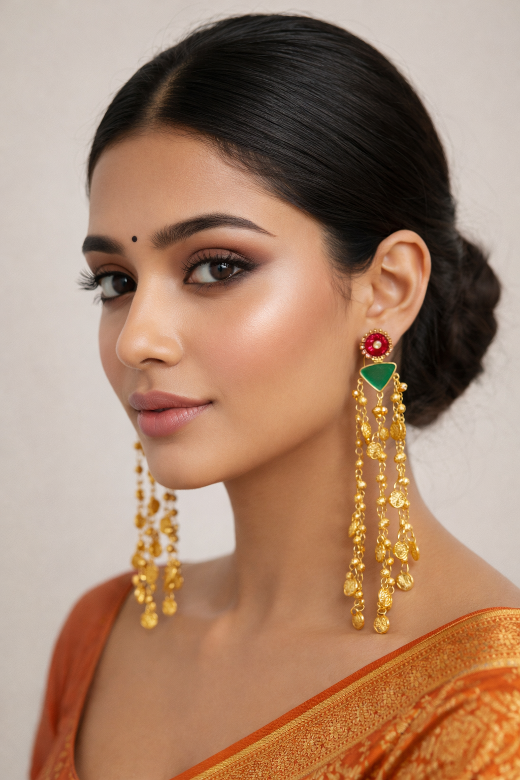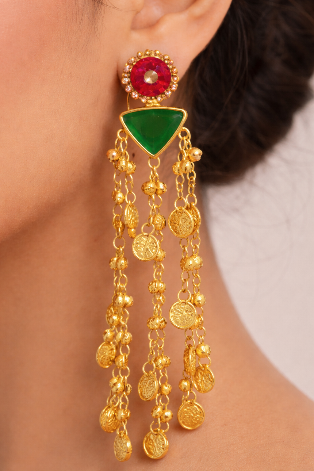 These stunning Kashmiri-inspired cascade earrings feature a bold red kundan-style stud, a rich green enamel triangle centerpiece, and multiple layers of delicate gold chains adorned with tiny beads and coin charms. The long, flowing design creates graceful movement, giving a regal and traditional look. Perfect for weddings, festive occasions, and ethnic outfits, these statement earrings beautifully blend heritage craftsmanship with royal elegance