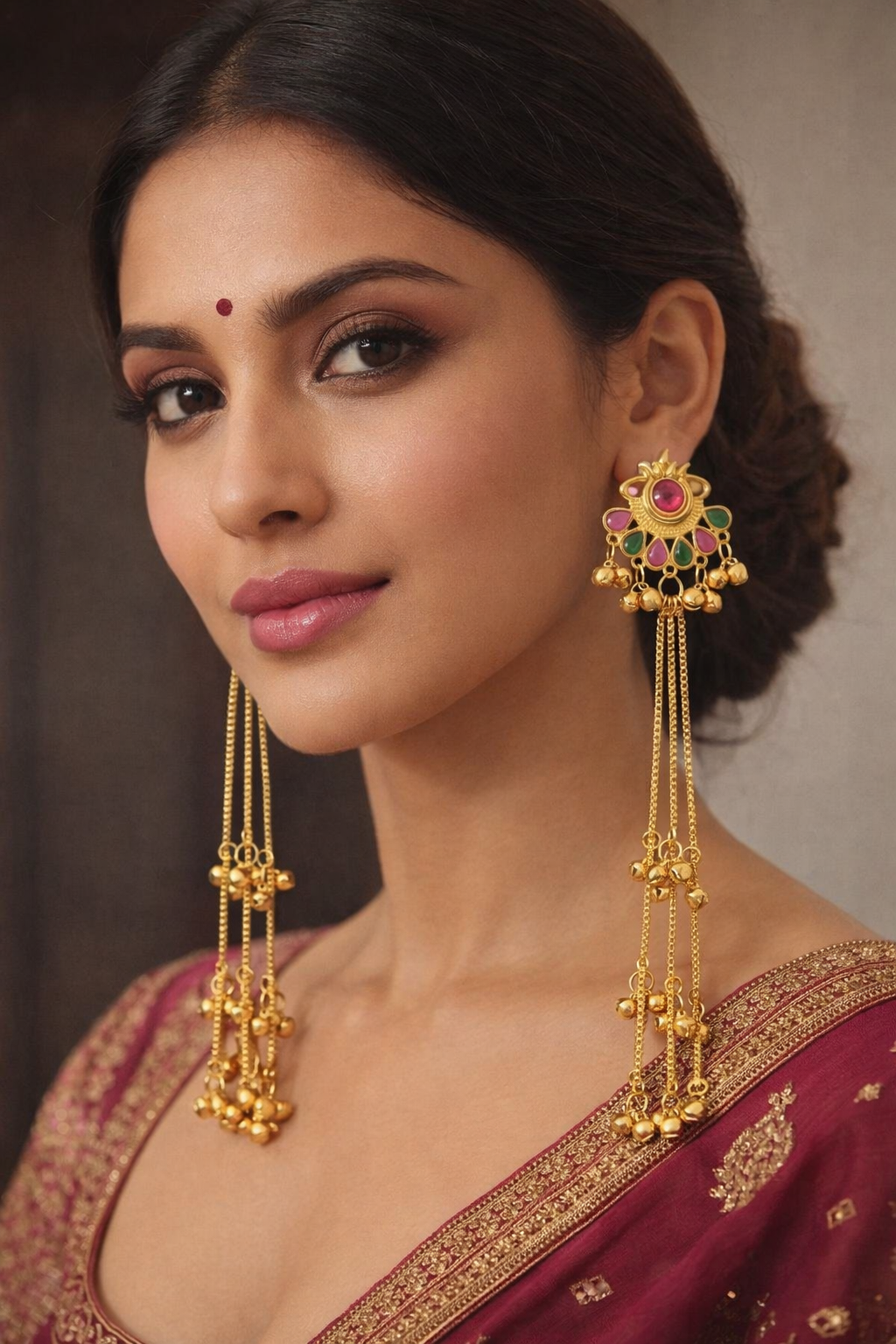 Elevate your ethnic look with these Royal Kashmiri Long Chain Jhumkas, crafted in a rich gold-tone finish. The top features a floral sun-inspired design adorned with vibrant pink and green stones, adding a traditional yet eye-catching charm. Delicate hanging ghungroo beads and multiple long chain tassels create graceful movement and a regal appeal.