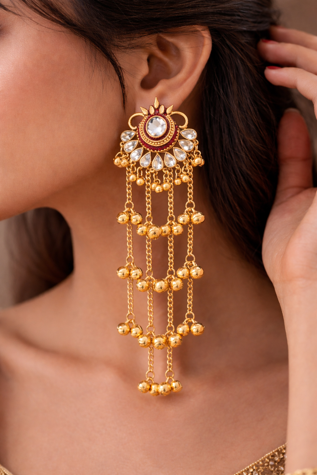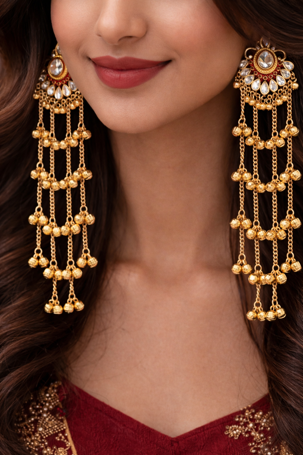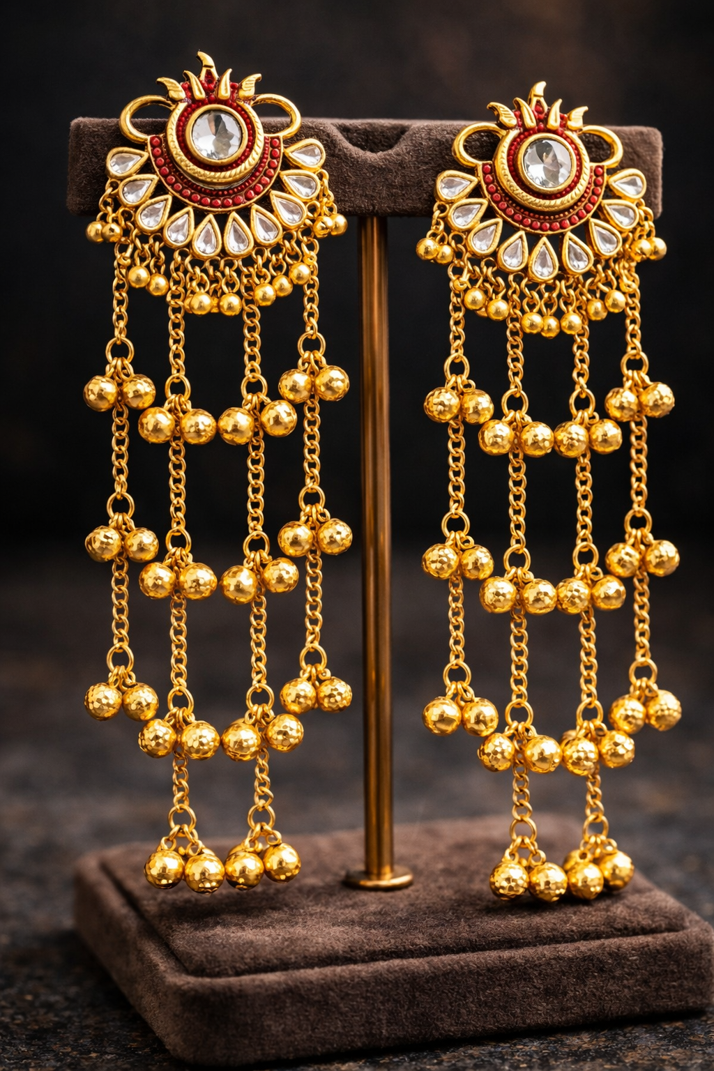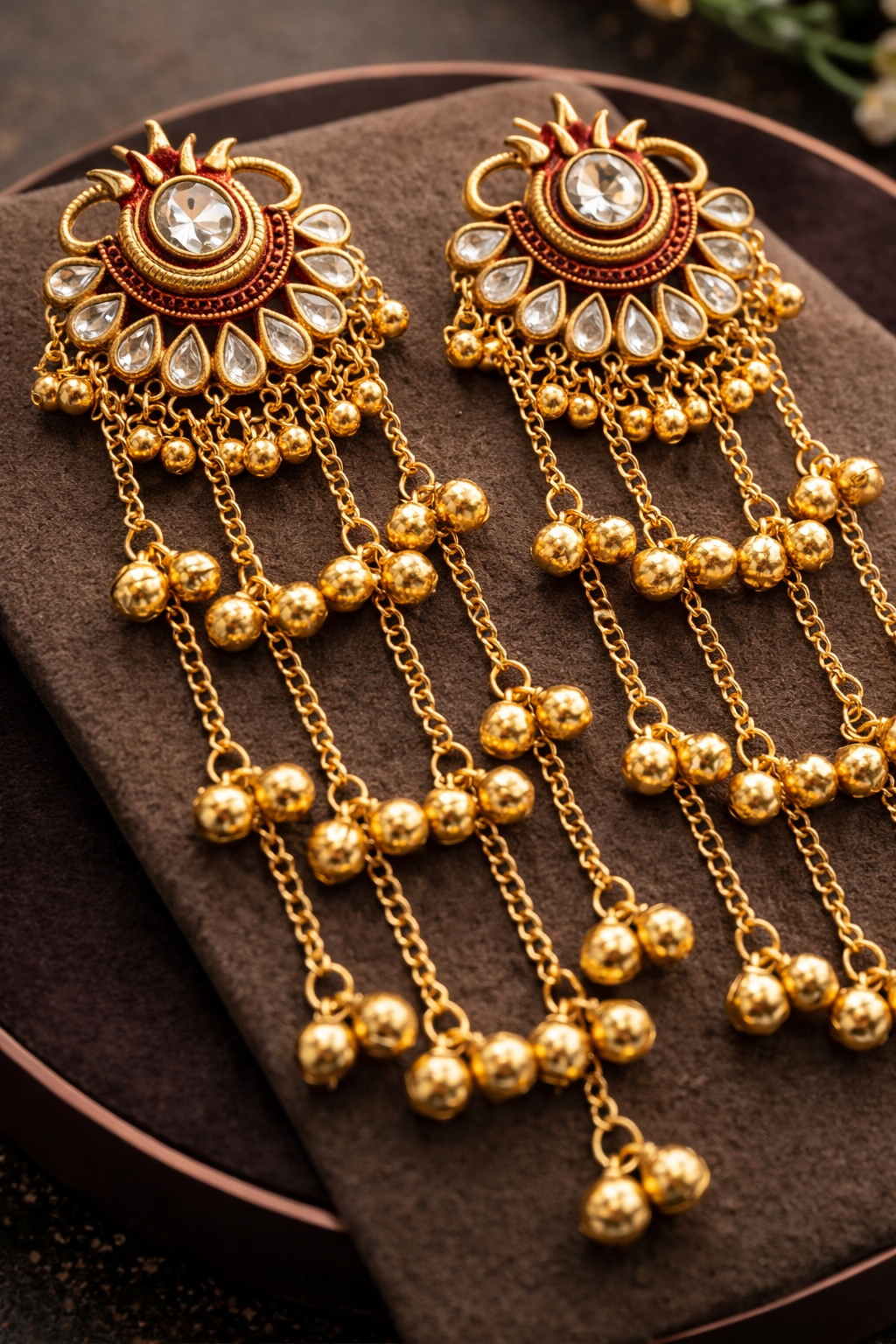 Add a touch of timeless elegance to your look with these Royal Kashmiri Kundan Jhumka Earrings. Designed in traditional Kashmiri style, these earrings feature a beautifully crafted kundan centerpiece with red enamel detailing and multiple layers of dangling golden beads that create a rich, graceful movement.