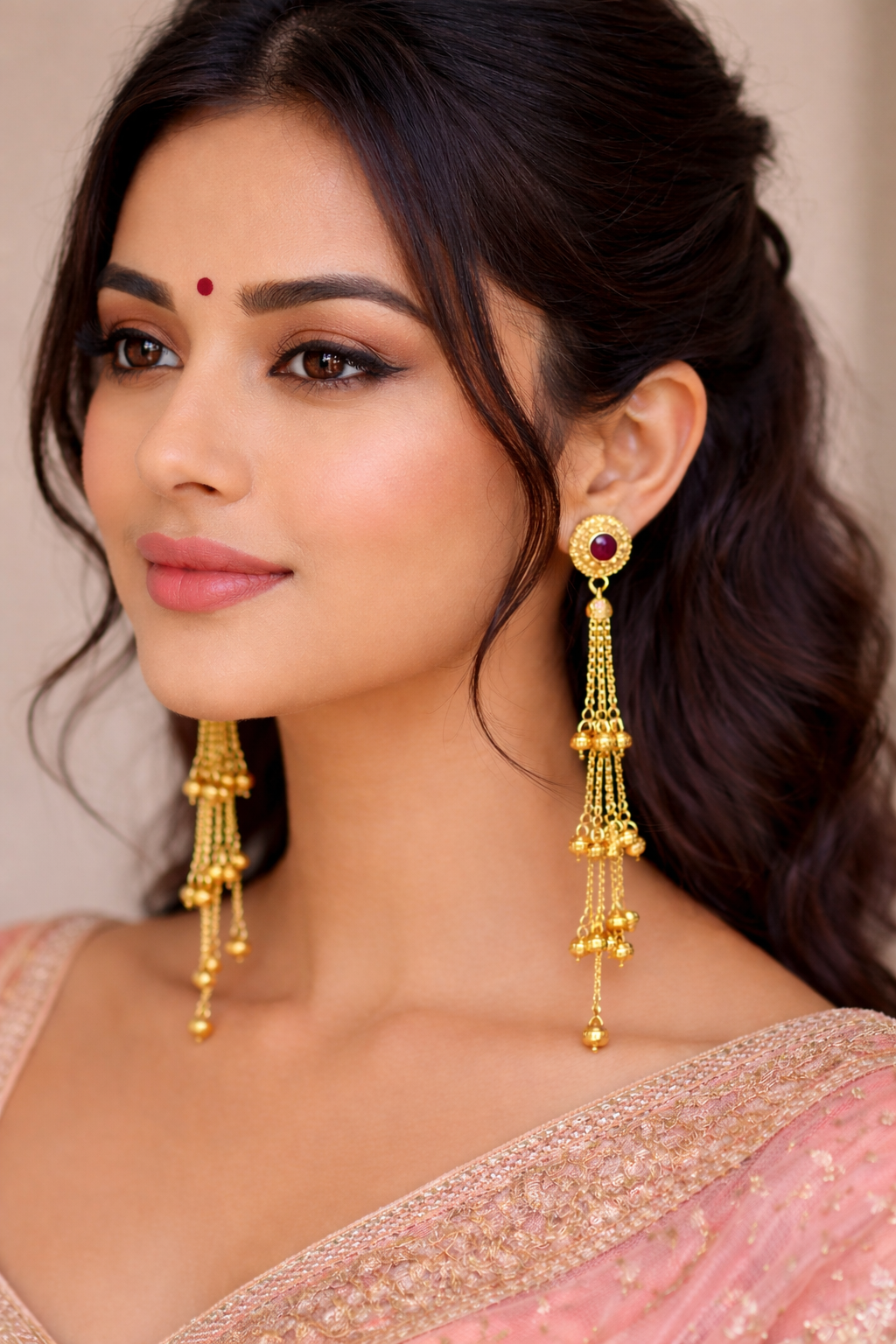 These elegant long tassel earrings feature a round gold stud top with a deep ruby-red stone at the center, surrounded by intricate textured detailing. Multiple delicate gold chains cascade down gracefully, adorned with tiny gold beads and a bell-shaped drop at the end. The design gives a rich traditional look with a modern long-drop style, perfect for weddings, festive occasions, and saree or lehenga outfits.