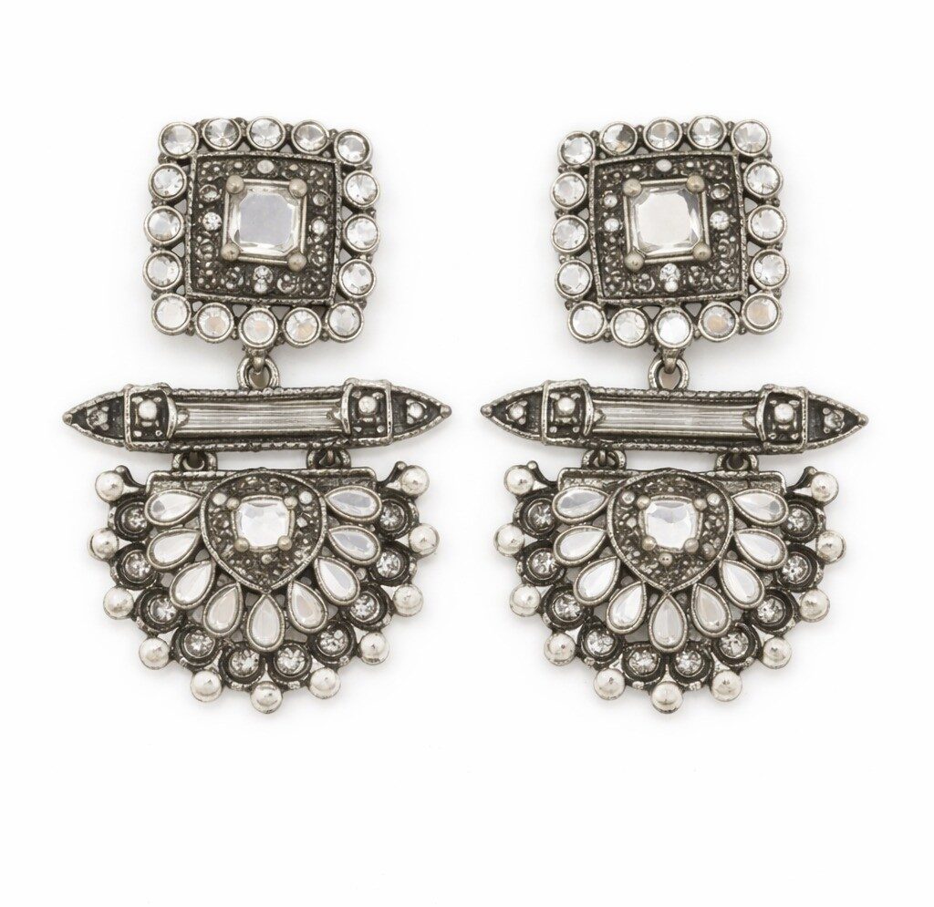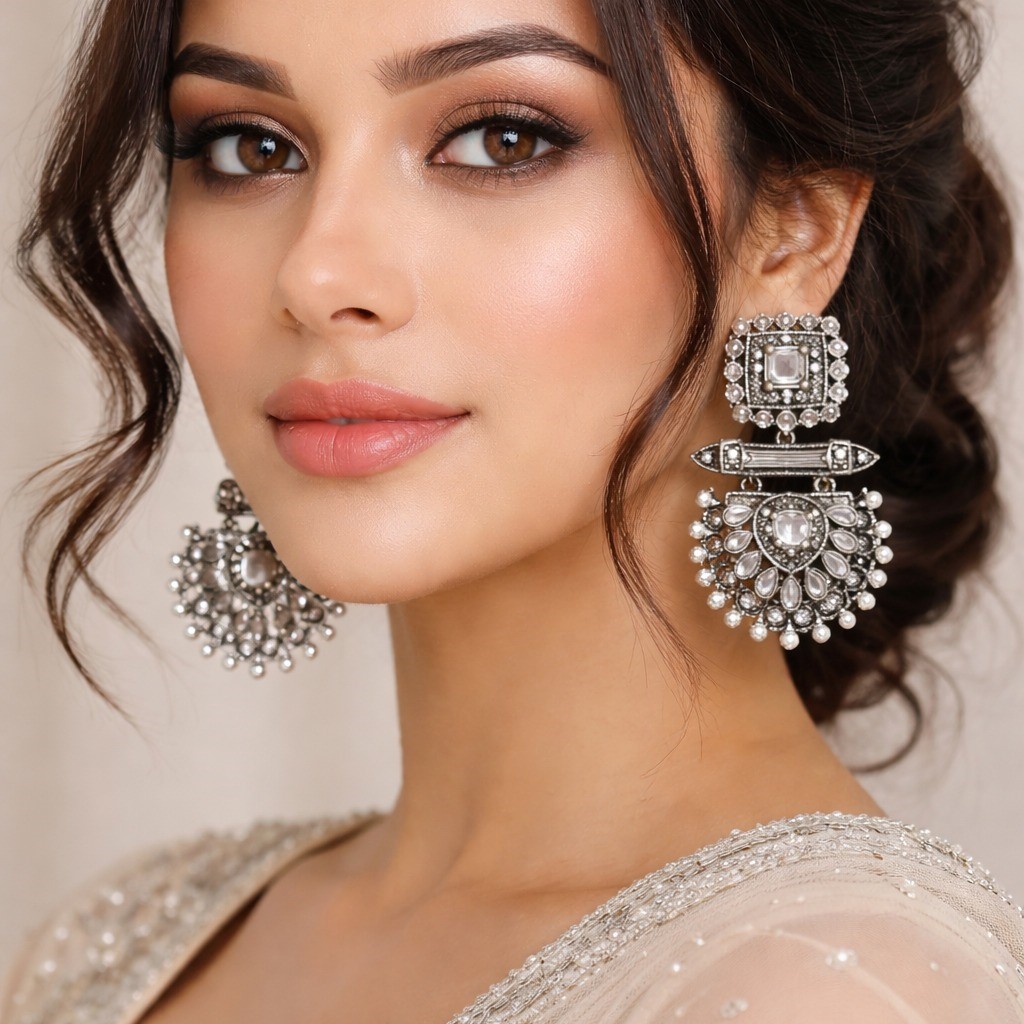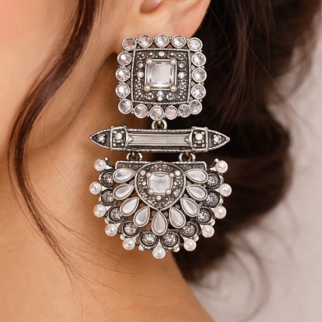 These luxurious silver-tone chandelier earrings feature a square stud top embellished with shimmering stones, connected to a beautifully detailed semi-circular drop adorned with tiny pearl-style beads. The intricate craftsmanship and sparkling finish create a regal and sophisticated appeal.