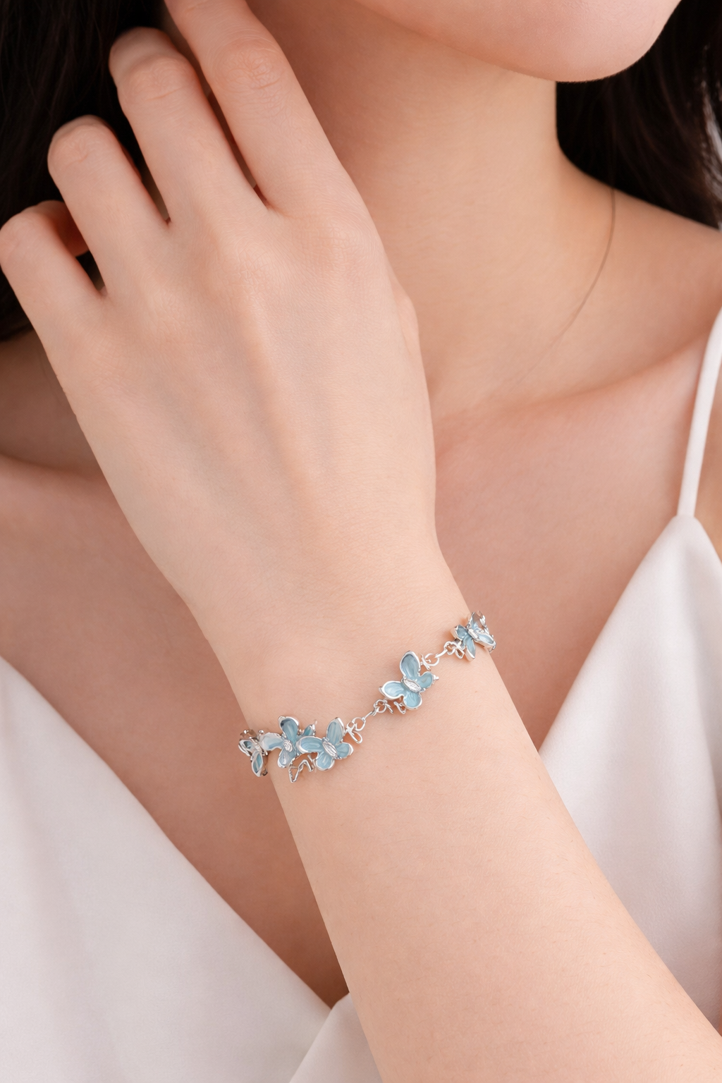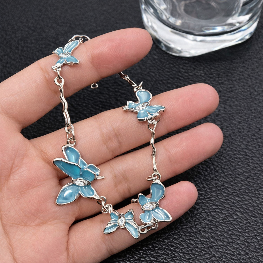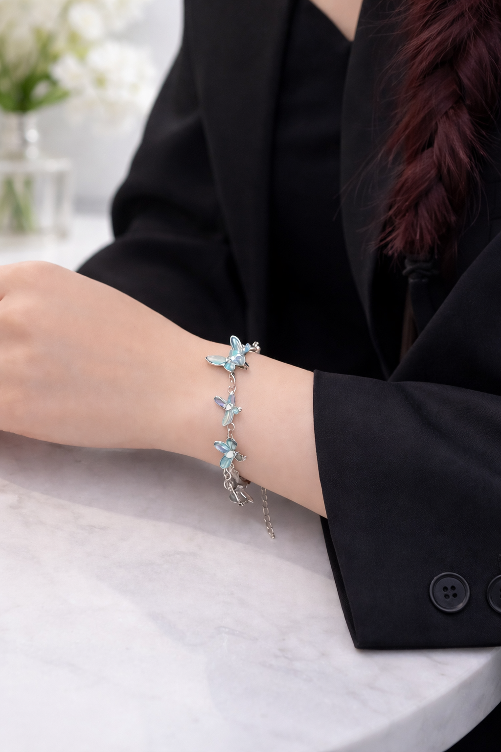 Delicate and graceful, the Sky Bloom Butterfly Bracelet features soft blue butterfly charms linked with a fine silver-toned chain. Inspired by nature’s elegance, each butterfly adds a light, airy charm that beautifully complements your wrist. Perfect for everyday wear or special occasions, this bracelet brings a subtle pop of color and a feminine touch to any outfit. A lovely choice for gifting or treating yourself to something timeless and elegant. 💙🦋